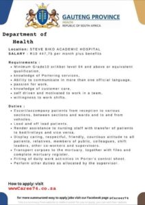 • Problem-solving ability • Patience • Love of people • Organisational ability • Leadership ability • Flexibility • A sense of humour • Calmness duringa crisis • Communication, numeracy and life skills • Computer literacy • Study skills • Honesty• Compassionate and caring Individuals who are prepared and willing to work night duty weekendsand public holidays are invited to apply for a limited number of Student Nurse posts. All short-listed candidates will undergo a compulsory assessment and following further shortlistingan interview.